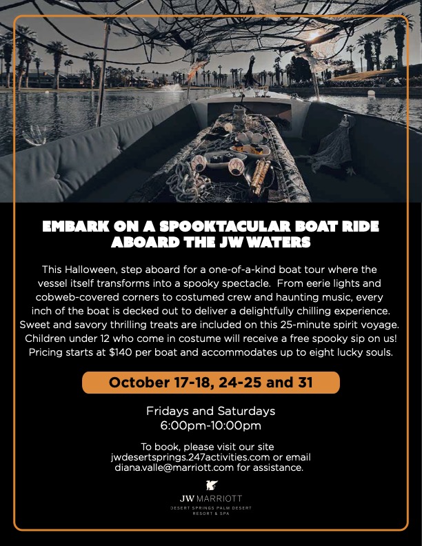 This Halloween season, the JW Marriott Desert Springs Resort & Spa in Palm Desert is putting a spooky twist on its popular electric boat rides. The resort’s sleek vessels will be transformed into floating haunted scenes, complete with eerie lighting, cobweb-covered corners, haunting melodies and a costumed crew ready to set the mood.