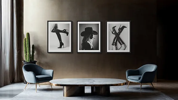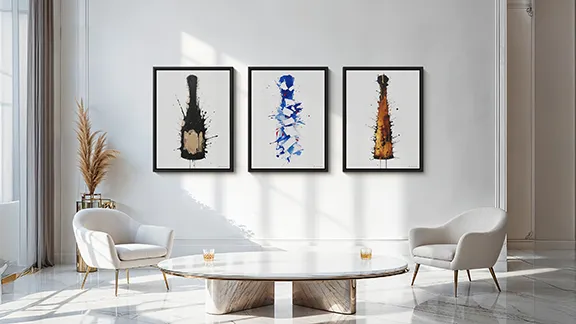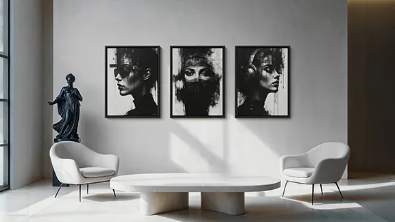 Our clients include homeowners, interior designers, hospitality projects, and commercial spaces. Right now, large-scale abstract minimalism, black-and-white compositions, inspired art, and bold architectural or urban themes are especially popular. Statement triptychs are trending over gallery walls.