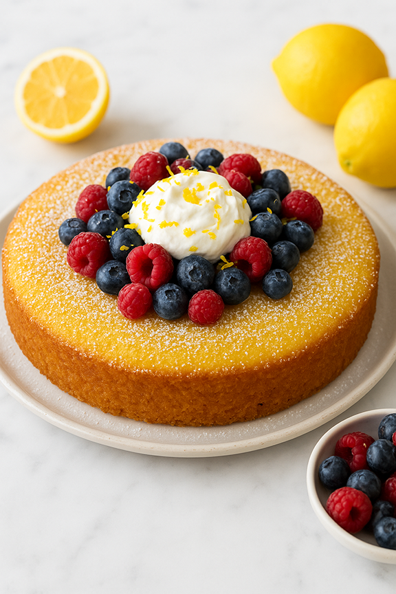In another bowl, whisk eggs, sugar, olive oil, milk, lemon zest, juice, and vanilla.